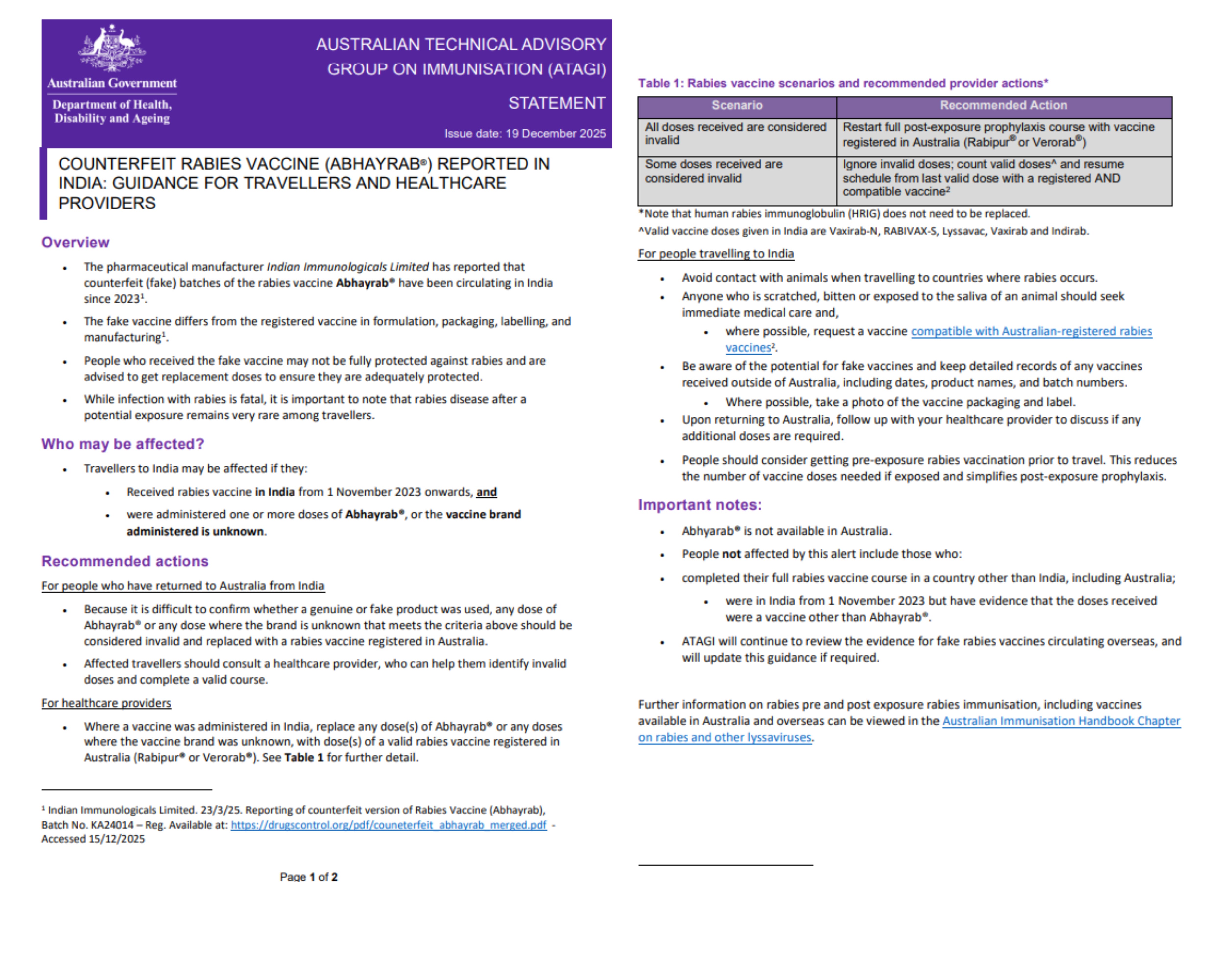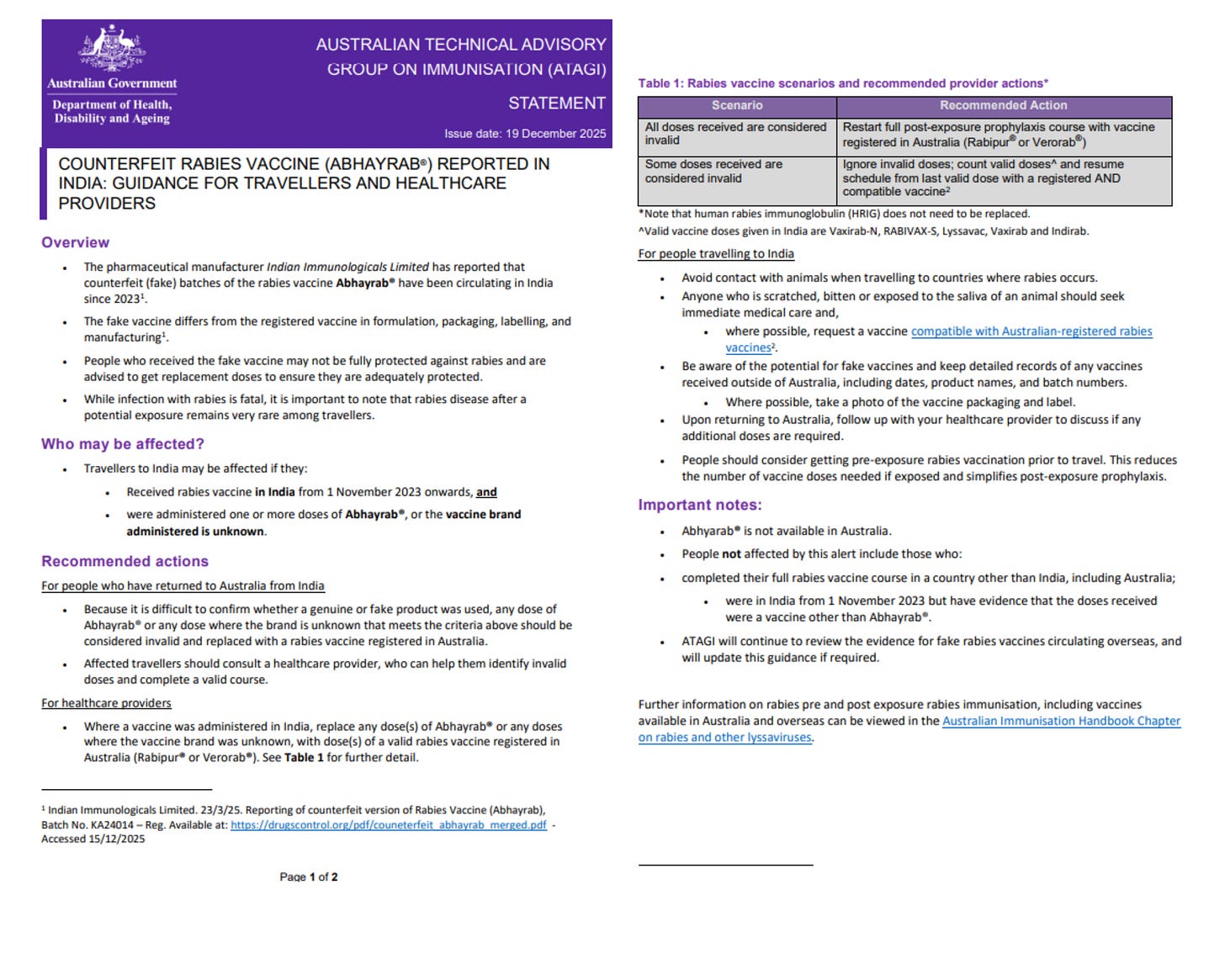 The Australian Technical Advisory Group on Immunisation (ATAGI) and Victoria’s Department of Health issued a health alert recently on the circulation of counterfeit batches of the rabies vaccine Abhayrab® in India since 1 November 2023.