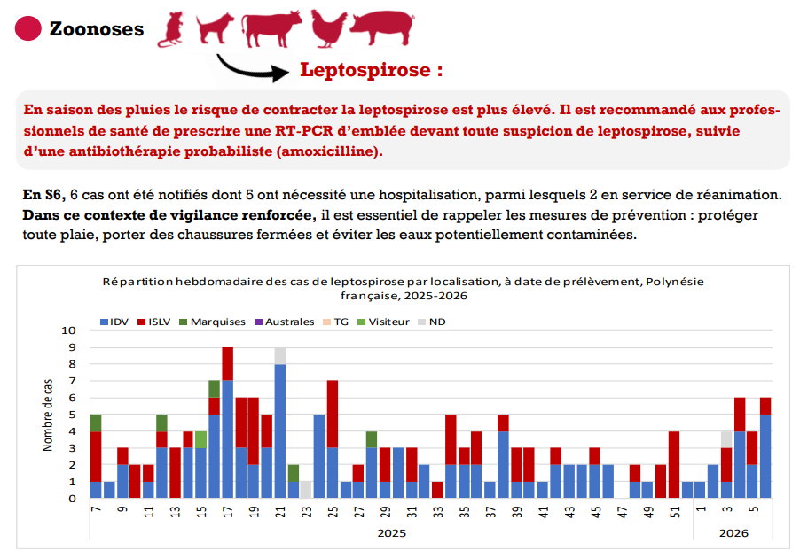 So far in 2026, 23 laboratory‑confirmed cases of leptospirosis have been reported in French Polynesia since the beginning of the year. The increase in cases has been linked to recent heavy rainfall, with several patients presenting severe forms of disease.