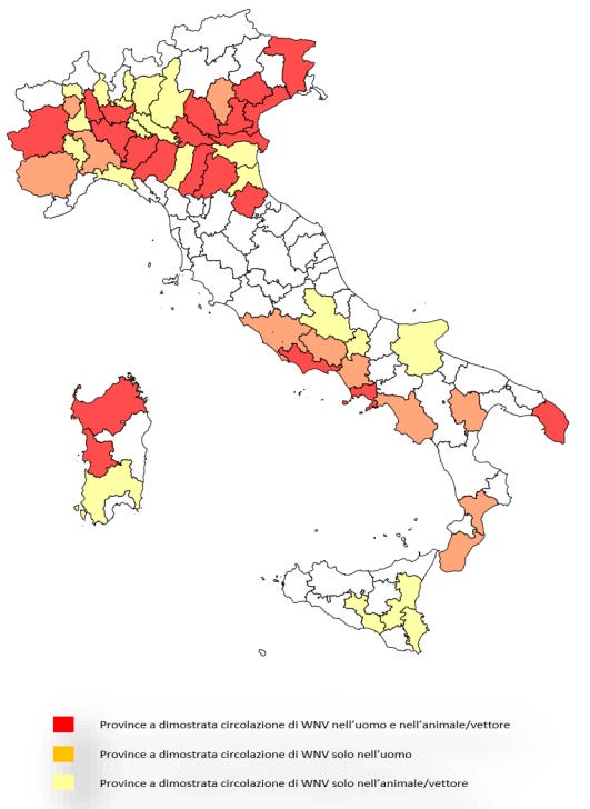The number of provinces with proven WNV circulation has risen to 52 (42 in last report) belonging to 15 regions : Piedmont, Lombardy, Veneto, Friuli-Venezia Giulia, Liguria, Emilia-Romagna, Lazio, Abruzzo, Molise, Campania, Puglia, Basilicata, Calabria, Sicily, and Sardinia.