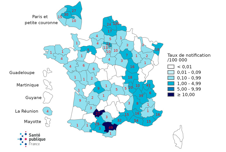 71 departments in France (70%) reported at least one case during the period, including 4 cases reported in the French overseas territories (Réunion). The five departments with the highest number of reported cases are: Nord (15%), Bouches-du-Rhône (6%), Aude (6%), Haute-Savoie (5%), and Isère (5%).