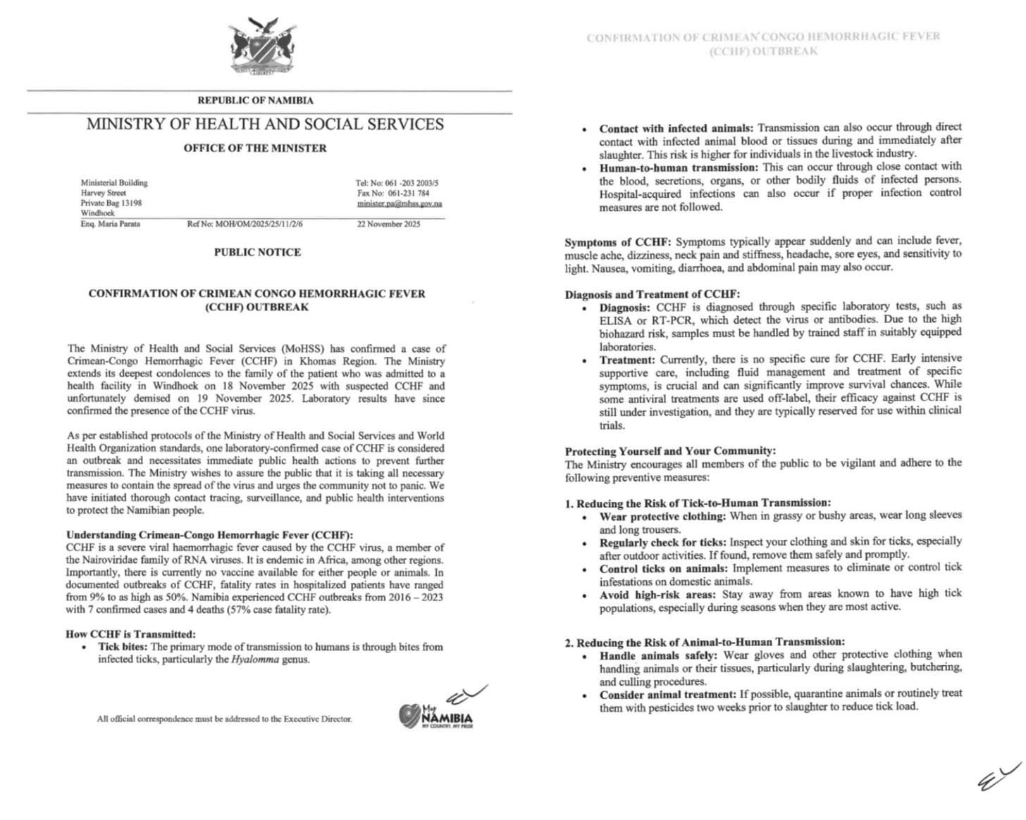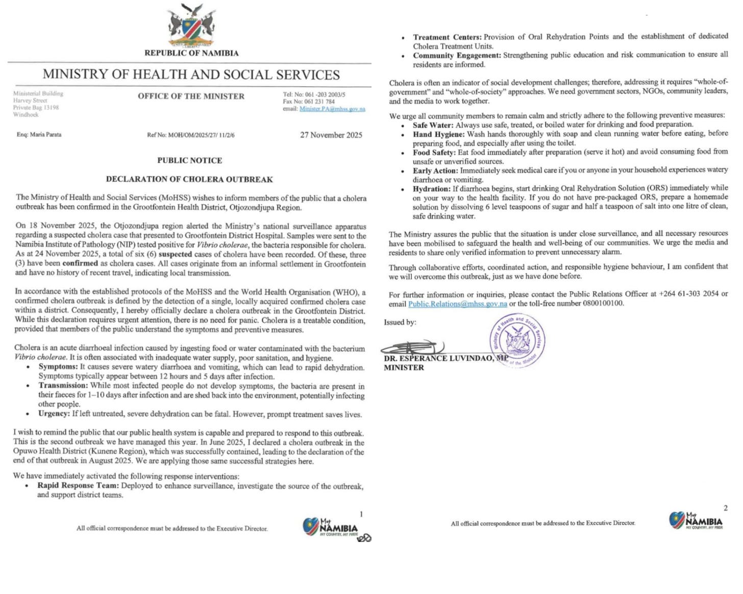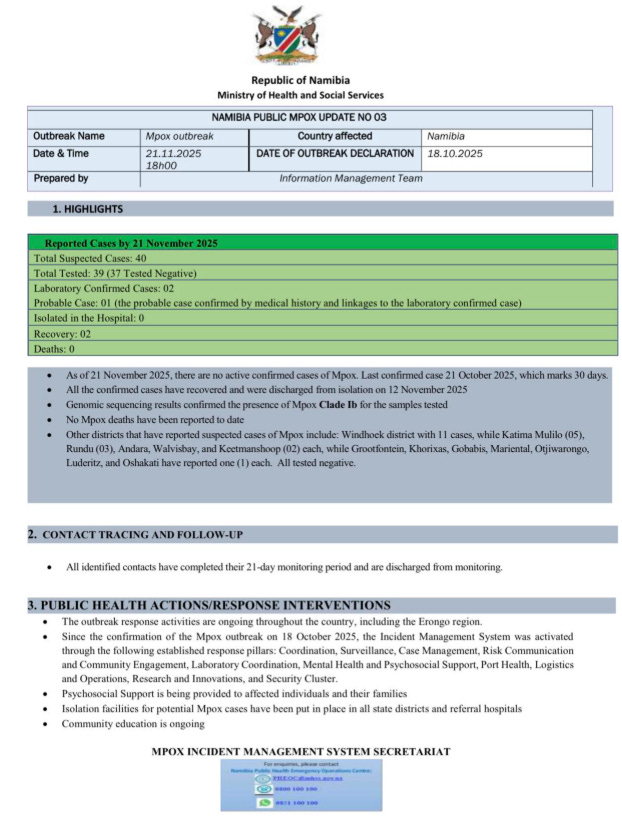 On Friday, the Hon. Dr. Esperance Luvindao updated the nation on Namibia’s current public health events: the Measles outbreak, the Mpox outbreak, the Crimean-Congo Haemorrhagic Fever outbreak, the Cholera outbreak, the start of the Malaria season, and a recent Polio event. She emphasized that surveillance remains strong, health teams are active, and vaccination campaigns are underway.