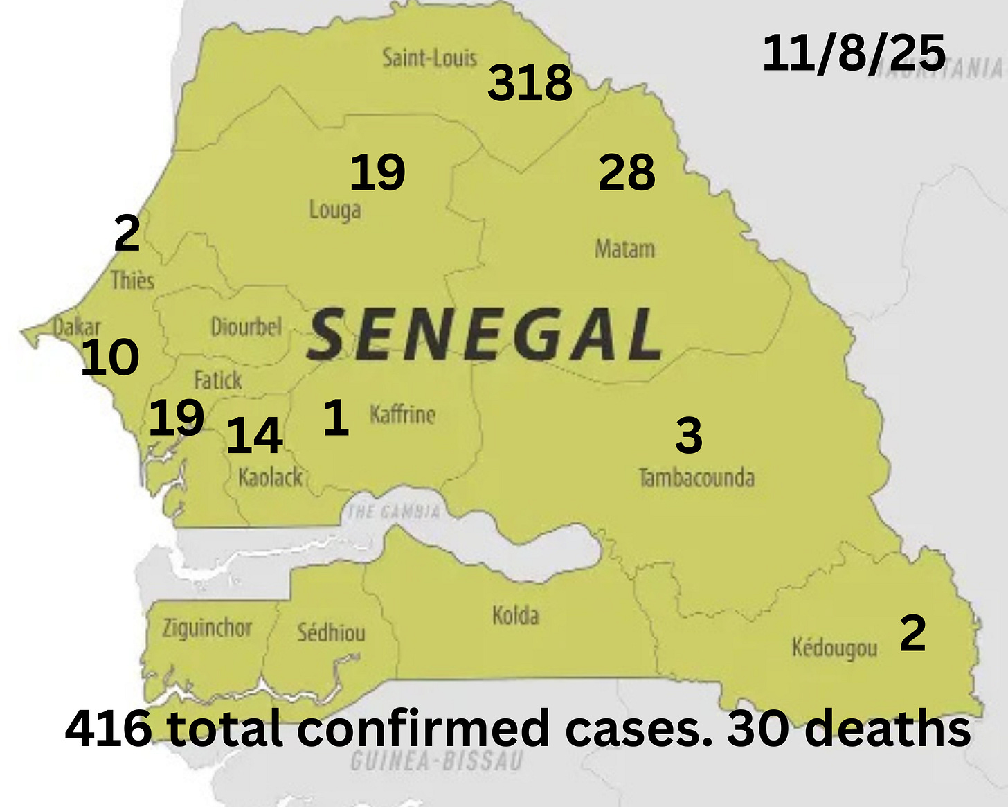 The ten regions include Saint-Louis (318), Matam (28), Louga (19), Fatick (19), Dakar (10), Kaolack (14), Thiès (2), Tambacounda (3), Kédougou (2) and Kaffrine (1).